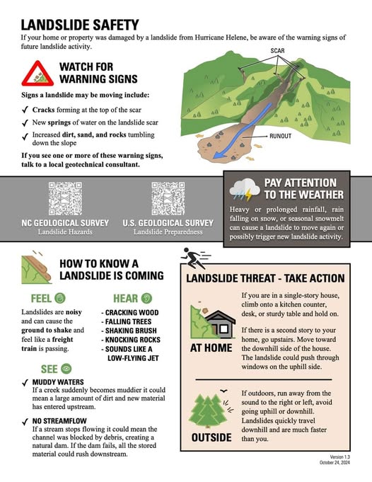 Landslides you’ll mostly see in the higher elevations/High Country, although I have seen some as far southeast as Spartanburg County. Remember – the rain and the tree loss were so dramatic during the storm, they unearthed entire boulders that came down from the mountains. I have seen homes that were taken out by landslides – and others I couldn’t believe were still standing. Especially up in McDowell, Mitchell, Avery Counties, but that’s just what I’ve seen. ETA: I shouldn’t leave out Rutherford and Polk either.