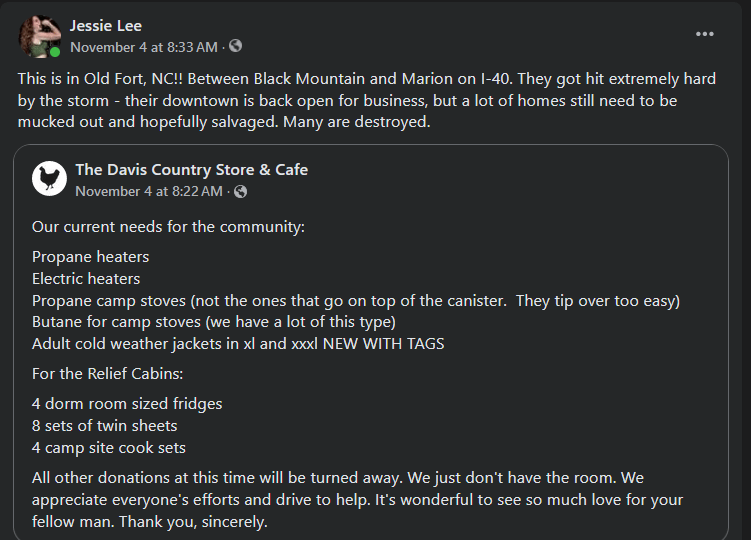 UPDATE 11/4: needs at The Davis Country Store & Cafe in Old Fort have changed – see their page for more details. They need heaters, cold weather XL and XXXL jackets, dorm fridges, bedsheets, camping stoves, butane.