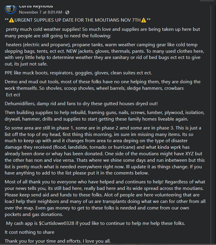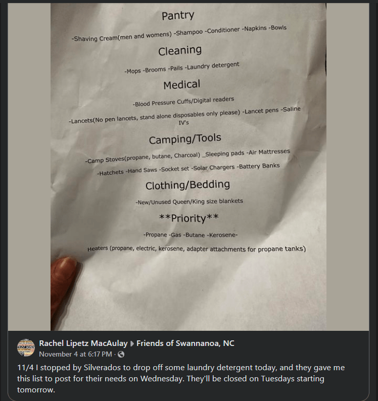 Before the WNC situation, most folks followed me for my takes on music or politics (I prefer both of them to be independent.) Western North Carolina is a deeply politically divided region – yet in the wake of Helene and the urgency of survival that united us all under a common banner, partisan politics had become an annoyance, a fly buzzing at my ear to remind me that there were people in this country who just didn’t understand how critical our situation was right now.
