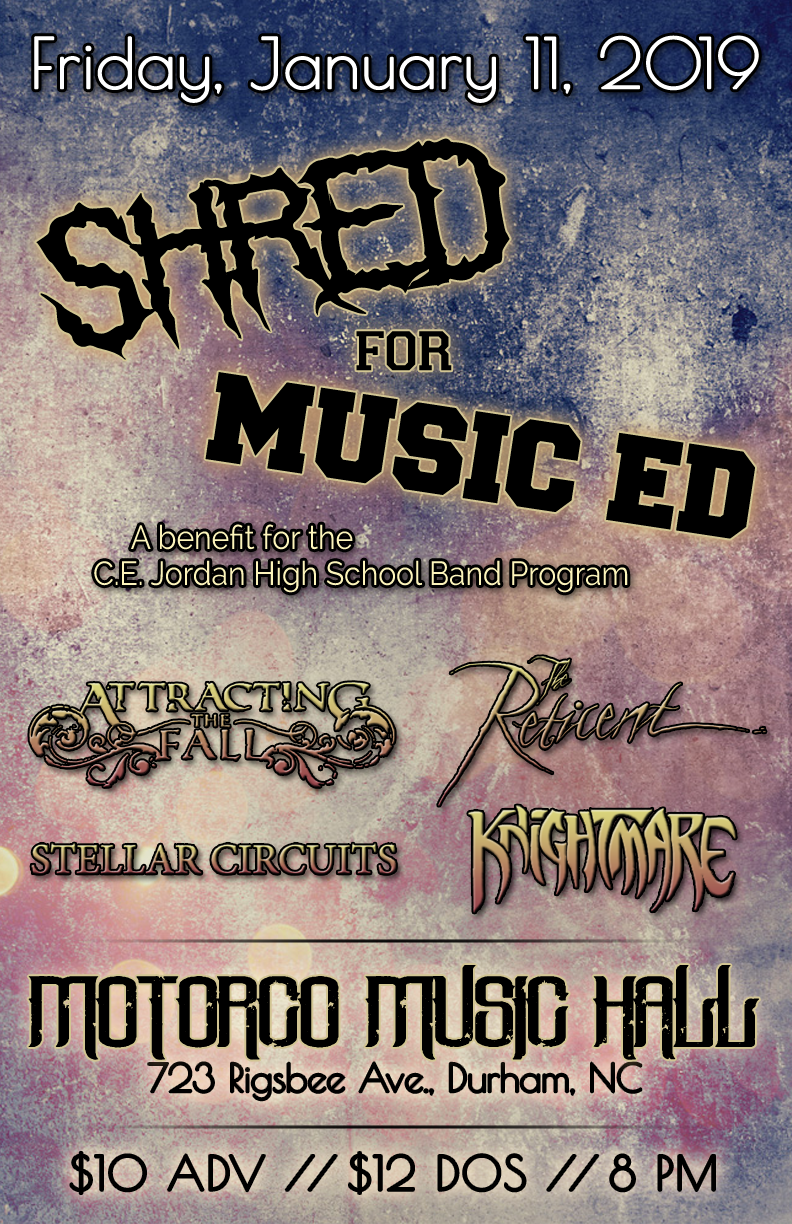 Shred for Music Ed 01-11-19 December 19, 2018 792 × 1224 Concert Booking & Marketing Flyer designed for Chris Hathcock (The Reticent/C.E. Jordan High School) for Attracting the Fall, The Reticent, Stellar Circuits, and Knightmare on January 11, 2019 at Motorco Music Hall (Durham, NC) Like Loading...