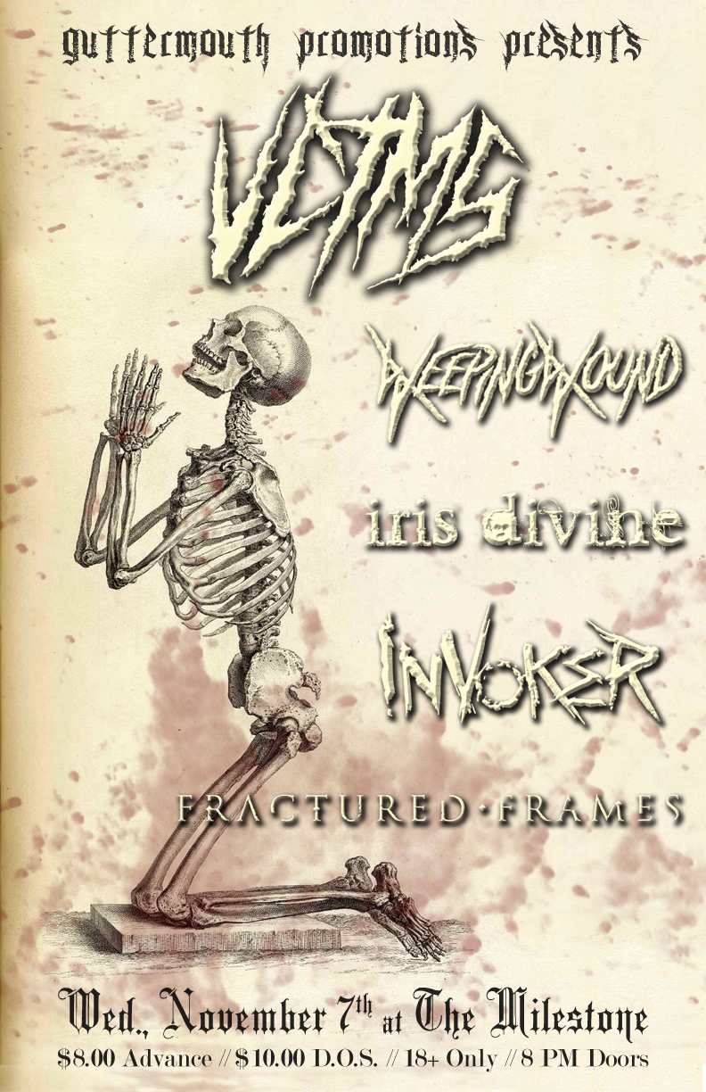 Guttermouth Promotions proudly brings two tours together for one exciting night at The Milestone Club in Charlotte, NC! Join us for up-and-coming metalcore juggernauts VCTMS and Weeping Wound, courtesy of Wavelink Agency; progressive metallers Iris Divine; with special guests Invoker, the local heroes returning to the Queen City for the first time in years, and Fractured Frames, rising stars from Asheville!